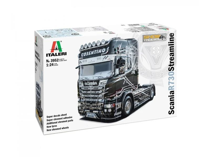 2005 lösten die schweren LKWs der Scania R-Reihe die Serie 4 ab. Die R-Trucks werden höchsten Ansprüchen an Kraftstoffverbrauch und Zuverlässigkeit gerecht, Scania-Motoren zeichnen sich durch Leistungsfähigkeit, Robustheit und Effizienz aus. Der V8-Motor des Topmodells R730 hat eine Leistung von 537 kW bei 1.900/min. Das markante Design verleiht dem Streamline Show Truck ein imposantes Erscheinungsbild auf der Strasse, der schwedische Hersteller Scania gilt nicht umsonst als die Nummer eins in Sachen Show Trucks. Das aussergewöhnliche Styling des Äusseren wird mit exklusiven Interieurs kombiniert, die Komfort für den Fahrer und eine breite Palette an Farb- und Materialoptionen bieten. Das Italeri-Kit enthält viele verchromte Kunststoffteile, die den R730 besonders realistisch wirken lassen. Ergänzt wird der Bausatz durch ein umfangreiches Dekors.