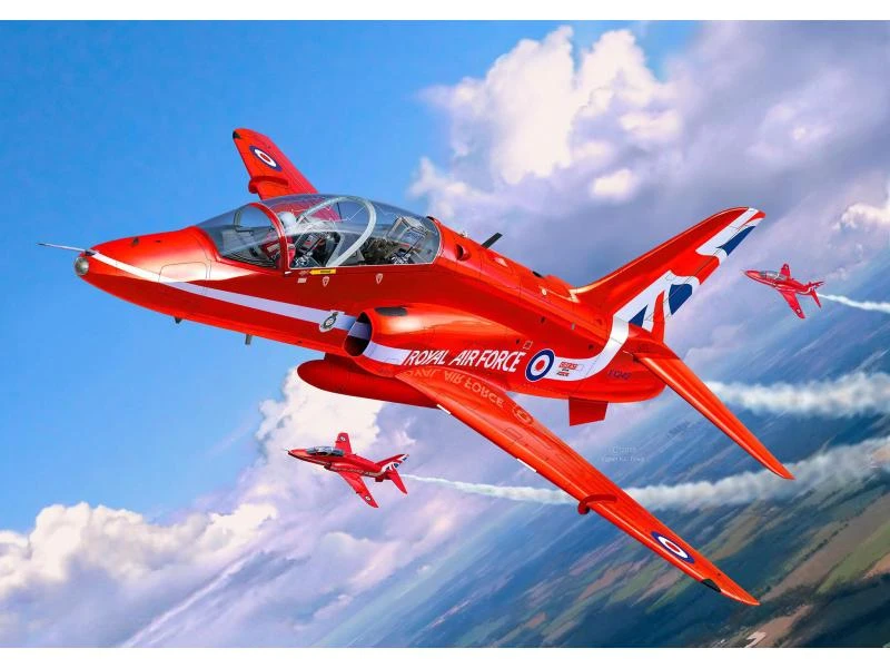 Die BAe Hawk T.1 Red Arrows gehört der berühmten RAF Kunstflugstaffel an. Die beiliegenden Abziehbilder zeigen die Beschriftung des Royal Air Force Aerobic Teams und verleihen dem Modell noch mehr Authentizität. Auch der aus den Shows bekannte Rauchmitteltank ist beim Modell deutlich erkennbar. Die charakteristischen Luftbremsklappen sind ebenfalls filigran herausgearbeitet. Das Cockpit bietet Platz für zwei Piloten und weist einen hohen Detailgrad auf. Die Sitze sind strukturiert und Sie können einzelne Bedienelemente wie der Steuerknüppel erkennen. Die Kanzel ist mit Klarteilen ausgestattet und kann daher jederzeit eingesehen werden.